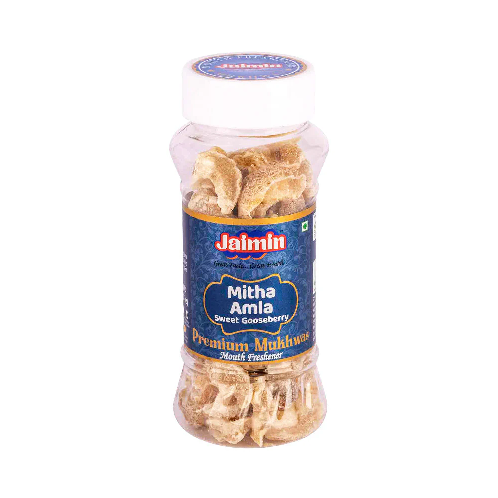Jaimin Mitha Amla is a sweetened Indian gooseberry (amla) preparation, combining the natural tangy flavor of amla with a mild sweetness. Known for its rich vitamin C content and antioxidant properties, it’s enjoyed as a health-boosting snack or digestive aid.